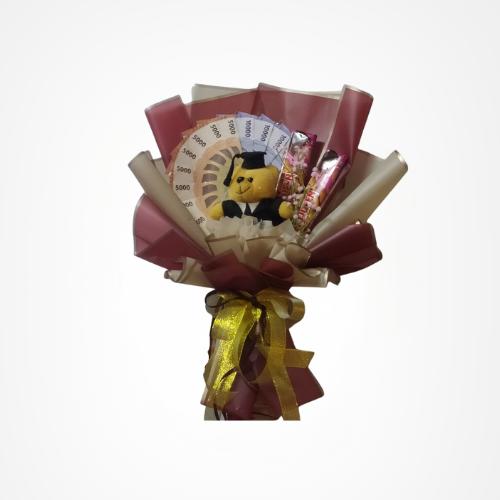 Perpaduan warna wrapping yang hangat dengan pita emas memberikan kesan mewah dan premium, membuat buket ini tampil eksklusif dan siap langsung diberikan sebagai hadiah istimewa. Kombinasi uang yang bermanfaat, boneka lucu yang bisa disimpan sebagai kenang-kenangan, serta cokelat yang bisa langsung dinikmati menjadikan hadiah ini terasa lengkap dan penuh perhatian.