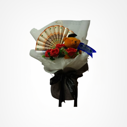 🌹 Buket hadiah premium yang dirancang khusus untuk merayakan momen kelulusan yang membanggakan. Dalam satu rangkaian elegan, terdapat susunan uang kertas yang ditata menyerupai kipas, dipadukan dengan boneka teddy bear bertopi wisuda serta bunga mawar merah yang melambangkan kebanggaan dan cinta.